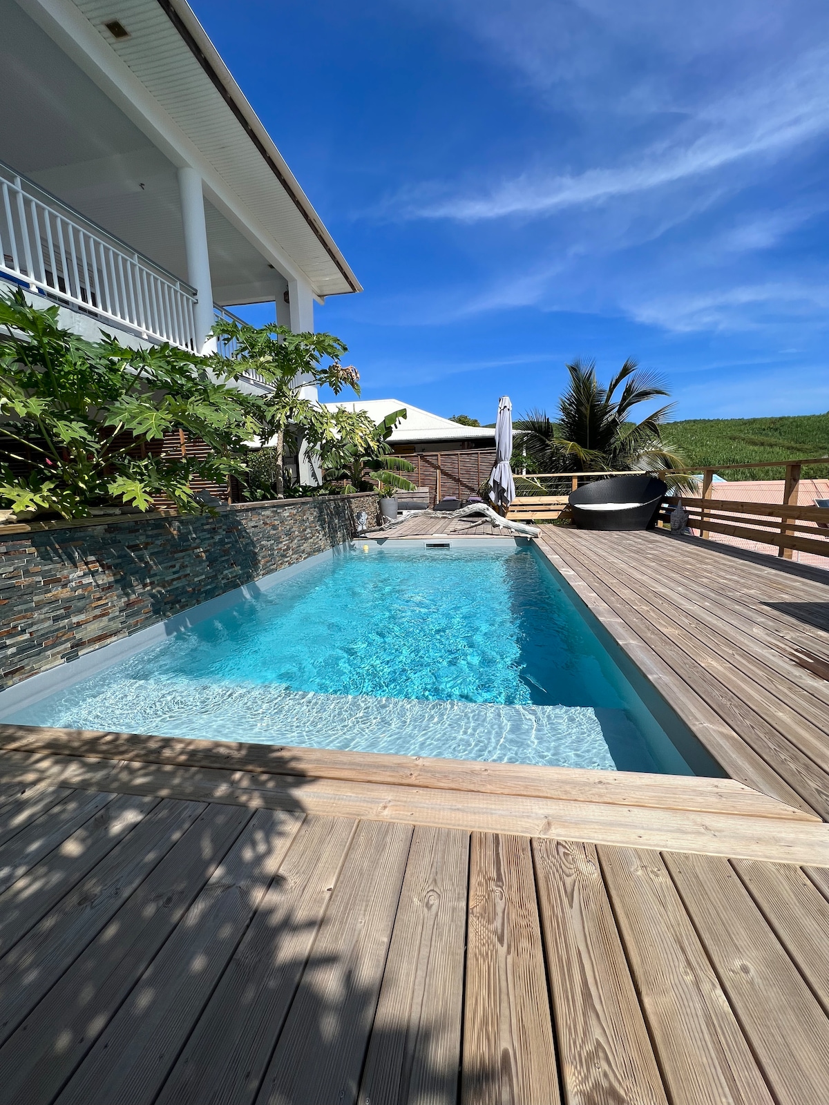 The F3 Hibiscus is one of the 2 apartments that make up the villa nestled in the small town of Trinité, facing the beautiful Bay of La Caravelle. From its terrace, you can feel the gentle trade winds, while you contemplate the panoramic view, optimal relaxation assured! You can enjoy the heated pool, made of natural stone and surrounded by palm trees, also with views of the bay to extend this relaxation.