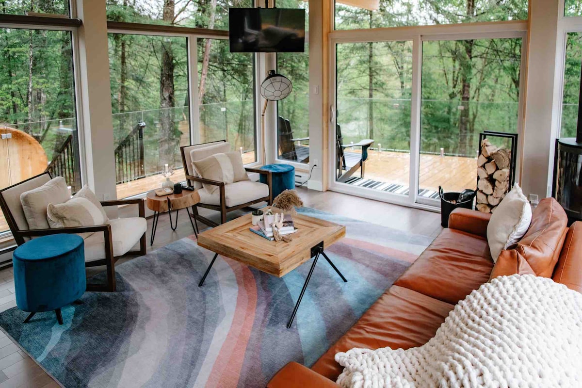 Welcome to La Khabine! This cozy, modern cabin comes with all you need to relax and connect with nature. Enjoy a glass of wine with the sound of a crackling fire in the wood burning fireplace. Take in the view of the forest through the surrounding floor to ceiling windows. Relax in the private outdoor cedar barrel sauna. Natural self-care products, firewood, laundry soap, and high-speed Wi-Fi are all complimentary. We hope you'll love our little cabin of windows as much as we do :)