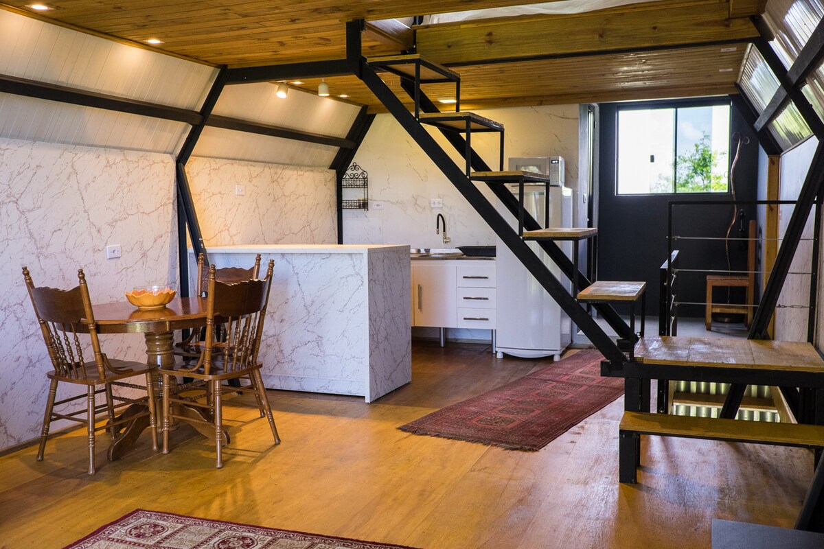 Take it easy at this unique and tranquil getaway. Surrounded by nature, beaches and lagoons. View of the entire surrounding area through the mezzanine balcony, where you can enjoy the most beautiful sunsets. Metal chalet built on a container with mezzanine, all tailored for a pleasant and unique stay. Ideal for those who want to enjoy nature with elegance.