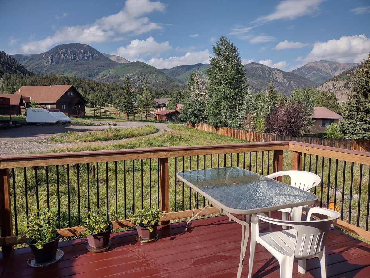 New glass front barrel sauna on our remodeled deck, no pet fees in our locally hosted, dog friendly cabin that’s clean and inviting! Only five miles from Creede, the access is easy but you’ll feel remote and private. Explore these pristine mountains staying only minutes from the continental divide where peace IS quiet. We offer true fiber internet, private creek fishing, clean accommodations, and a relaxing location with incredible views! Hiking trails leave from here!