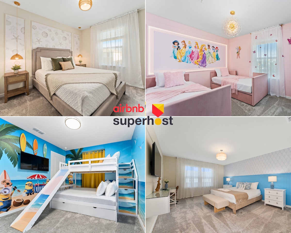 Embark on the ultimate getaway for up to 12 guests! Dive into a world of wonder with two stunning themed rooms: one for Minions fans, the other for lovely Princess. The remaining three bedrooms offer pure comfort for restful nights after days of fun! Soak up the Florida sun, then unwind in your private pool for the perfect end to each magical day. *Themed Breakfast service is optional at an additional fee.