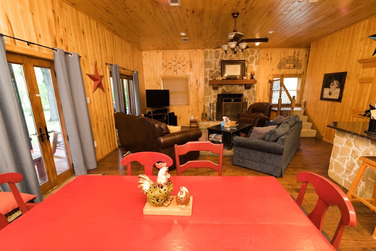 Our newly built 1300 sf large private cabin nestled under a large oak tree, positioned right on the bank of our private 2.5 acre lake with its own dock. Sleeps up to six guests, plenty of parking, and has three beds, a 90-year-old restored pool table upstairs in the large loft, 3 porches (both back porches overlook the lake) and custom cabinets throughout made of local hickory. Enjoy all the displayed paintings, photography, sculptures and cut stones all created by the hosts.