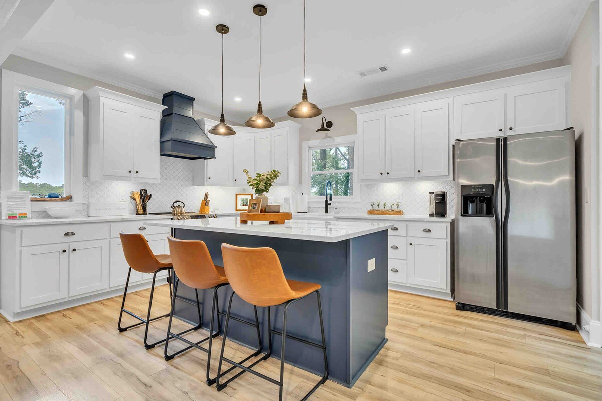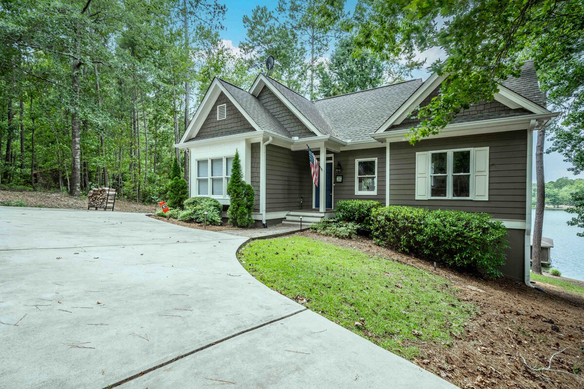 Southern Living Design. Built in '22. Enjoy 4500 sq ft of living space and 2 acres with 400 ft of lake frontage. Sleeps up to 16 with 5 king beds and 5 baths en suite, a bunk room with 2 full beds and 2 twin beds. Includes a dock, outdoor fire pit, 6 bikes, 2 kayaks, 2 paddle boards, a canoe and row boat. Perfect for family lake fun, fall football games (UGA is 45 minutes away), The Masters in Augusta (90 minutes away). 5 miles from The Ritz, minutes from grocery, restaurants, movie theater.