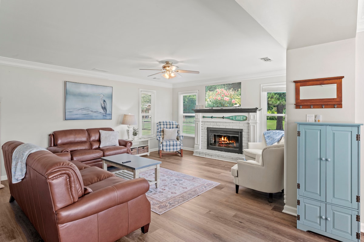 Lovely sunrises & moon views. 5 min to downtown, 2 min from The Club at Lake Sinclair & DG. Sleeps 6-8 people, (air mattresses/beds) Perfect for entertaining with outdoor dining areas. Fire pit with lots of seating. Big views of water & nearby sandbar, across from an island with beachfront space. Tons of amenities you may need, including a pack-n-play. For the hot-natured, white noise lovers we have large floor fans! Kayaks & paddleboards on site & Rubber Dockie that will entertain the kids.
