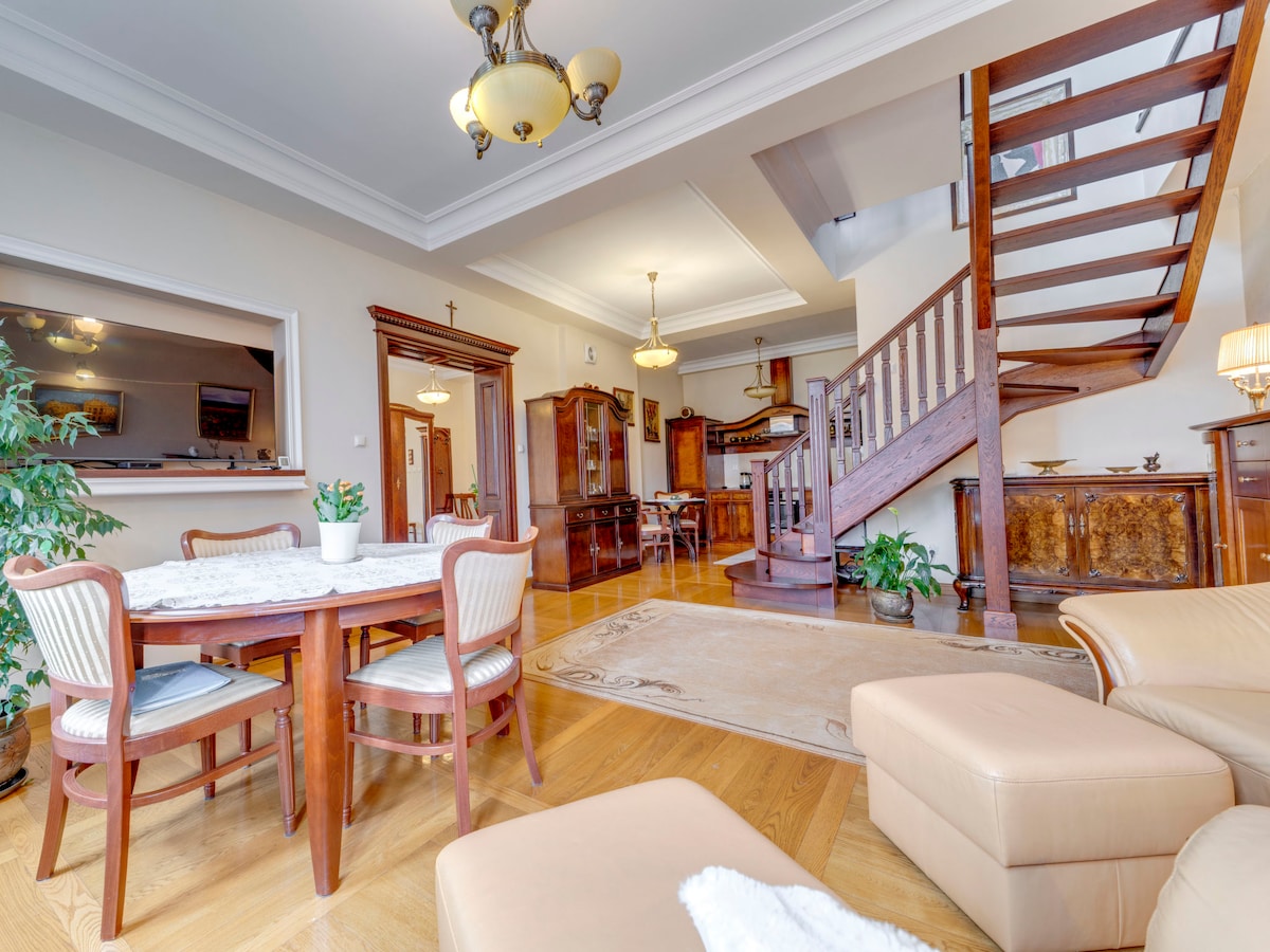 Experience modern comfort in this newly renovated 150m²+ 3 Bedroom, 2 Bathroom duplex in the heart of Zolynia. Stylish finishes flow throughout, from the sleek kitchen to the cozy living room with a fireplace. Enjoy morning coffee on the balcony overlooking Zolynia Town Square or relax in the small backyard. With spacious bedrooms, updated baths, and a prime location near shops and dining, this home is perfect for a comfortable stay. Book now for a stylish retreat in a charming town setting!