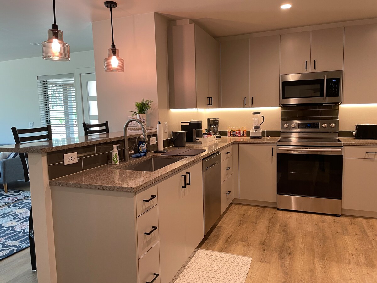 Enjoy the style and comfort of this brand new Hideaway nestled in a peaceful and central neighborhood just 3 minutes from shopping/dining at the Oakway Center and only 7 minutes from the University of Oregon. Enjoy your time out, then come home to relax with all the amenities amidst a clean and stylish interior. Or, blow off some steam by putting on your favorite vinyl record, dimming the lights and soaking in your giant two person soaker tub. 10% discount for booking the non-refundable option.