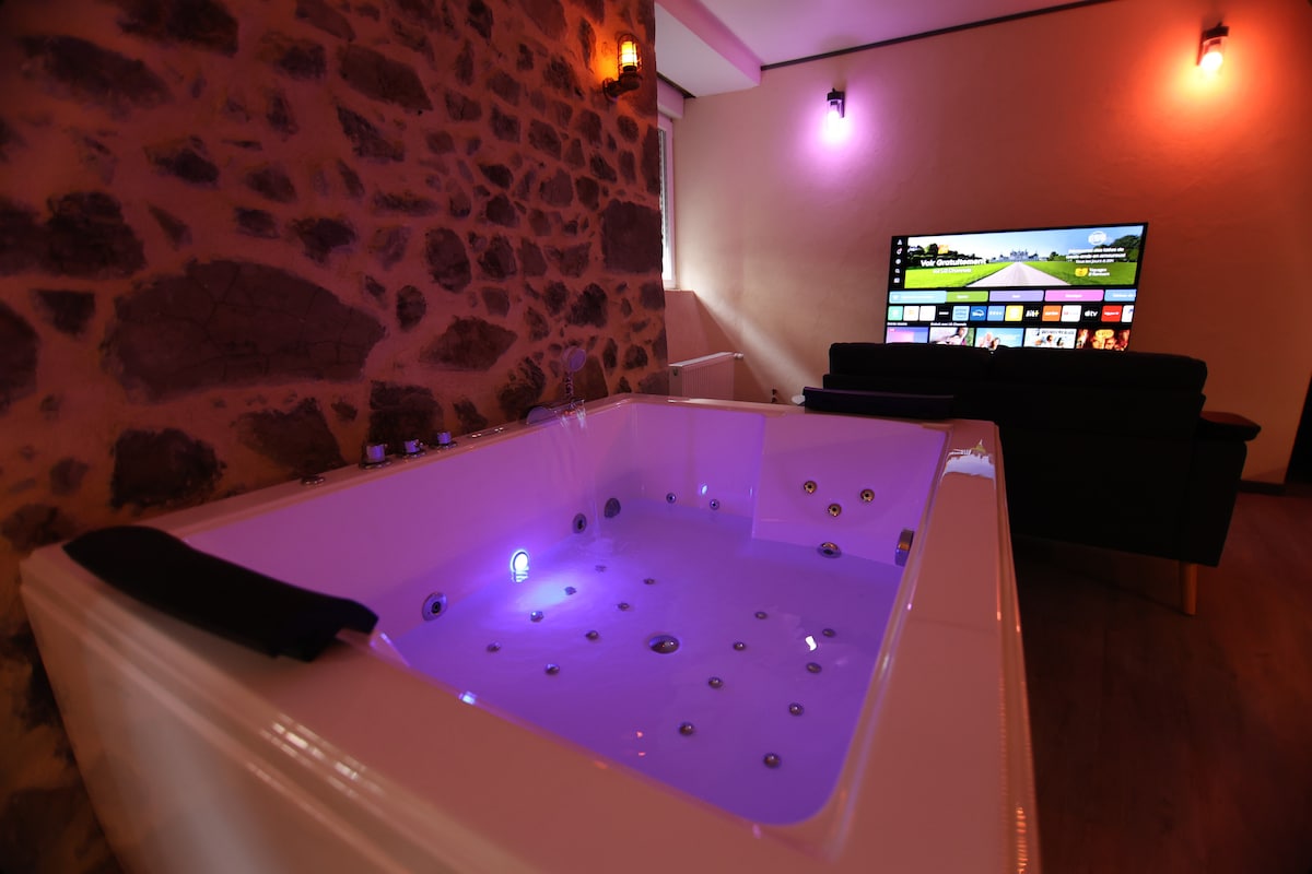 Nid douillet privé en entresol dans ancien hôtel rénové au cœur du village en desertification de Rochefort Montagne idéal pour randonnée, ski, et découverte de l'auvergne, du Sancy et de la chaine des puys. Baignoire à remous, climatisation, lit Emperor (2x2m), Matelas EMMA sur lattes, cuisine toute équipée avec lave vaisselle, four, four micro ondes, batterie d'ustensiles, fondue, crêpe, raclette, feux gaz et plaques induction, réfrigérateur SMEG, lave linge, sèche linge, TV LG
