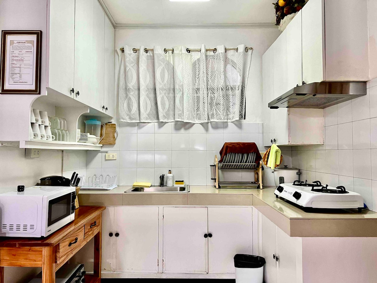 Relax in a logcabin-inspired duplex unit with 2 actual bedrooms and a spacious attic converted into a 3rd bedroom. It is a family home with fast internet, Cable TV, landline, air conditioned bedrooms, heated showers, full kitchen, Netflix, and open parking for 2. It is perfect for families who want a safe and quiet place to bond in. There is no Taal view from here, but the neighborhood is beautiful, lined with pine trees.