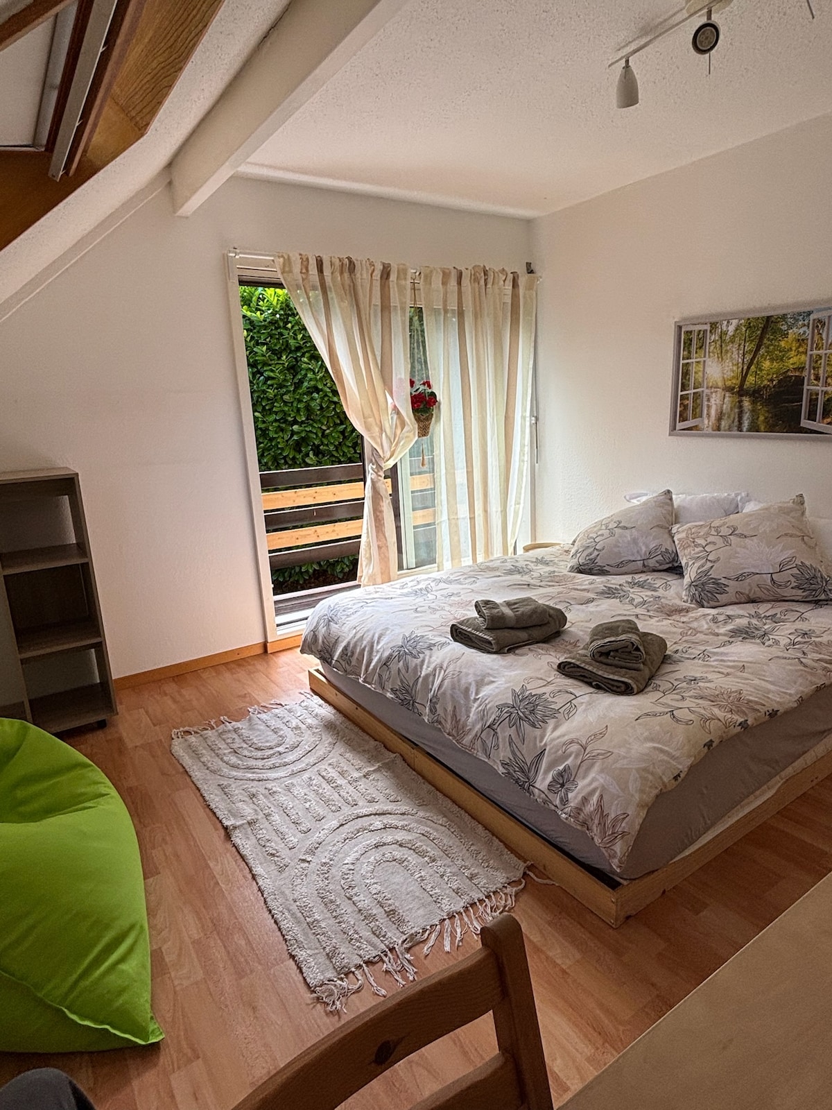 Cozy and independent 2-room apartment recently furnished in our house. Bright, modern and well laid out, it enjoys a lovely view and is located 8 minutes from the M1 metro to Lausanne-centre or UNIL and EPFL. 15-minute walk to the lake or Vaudoise Arena. The CHUV is easily accessible by metros M1 and M2. Separate entrance, living room with equipped kitchen and dining area. Bedroom with ensuite bathroom. Covered south-facing terrace with 2 armchairs.