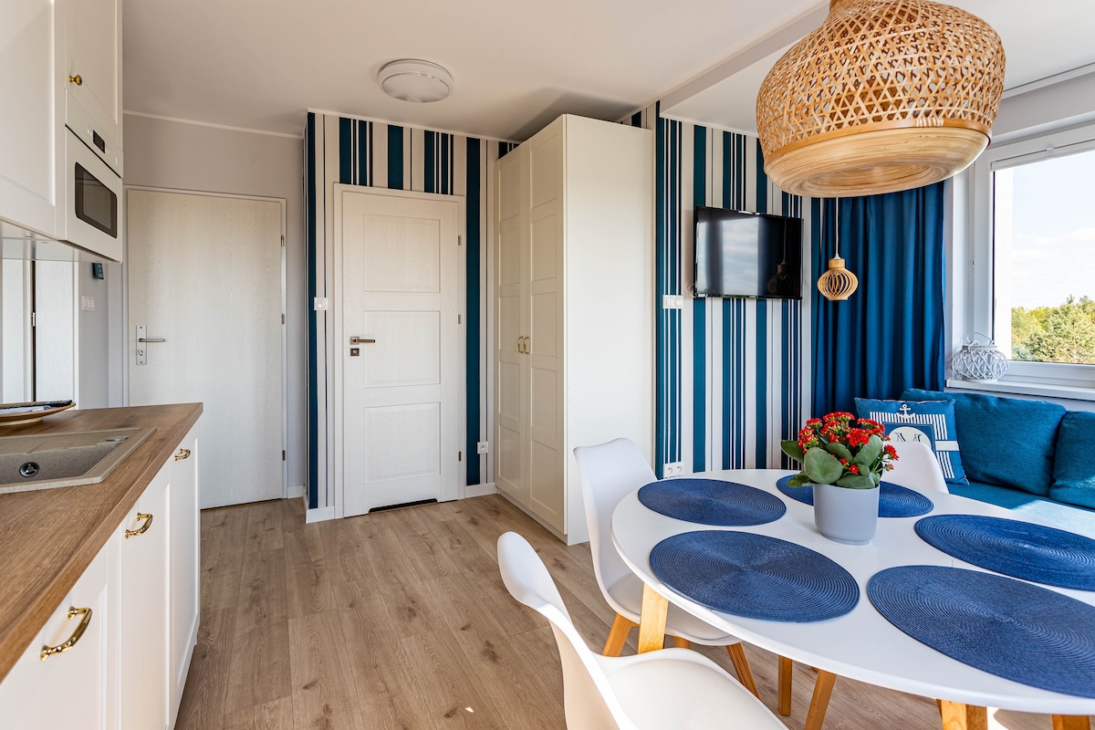 Aqua Przystań 80 apartment is located in Rumia, right by the Tricity area. It’s a perfect base for trips to the Hel Peninsula, Gdynia, Sopot, Rewa, Mechelinki, or Reda Aquapark. The apartment, styled in a seaside theme, impresses with its peaceful aesthetics and marine accents. A decorative fireplace creates a cosy feel, and a modern keyless entry system provides comfort and security. Guests have access to fast Wi-Fi, free garage parking, and an additional outdoor parking spot.