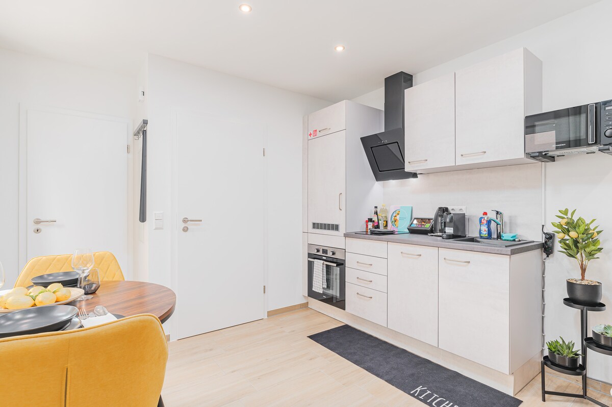 Our high-quality new apartment is located on the 4th floor in Echterdingen. The apartment is easily reached by elevator. The apartment is equipped with the following amenities: - BEST LOCATION: In just 2 minutes to the fair and Stuttgart airport. - Fast WiFi - Bedroom with king size bed - Bedroom with queen size bed - Fully equipped kitchen - Underfloor heating - Modern and large bathroom - Balcony with a great view of Stuttgart - Washer-dryer -Iron - and much more.