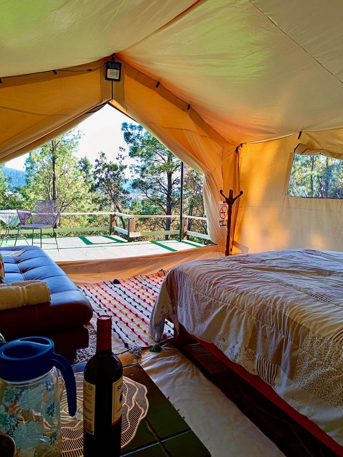 Connect, celebrate and breathe nature in Sequoya Cabin, located in the heart of Cañada de Alferes 15 minutes from Santa Fe, it has two bedrooms, a full bathroom, equipped kitchen, heating, smart TV, towels, shampoo and soap. You can add experiences with extra cost and anticipation such as: campfire, cinema, charcuterie and a walk in the forest!