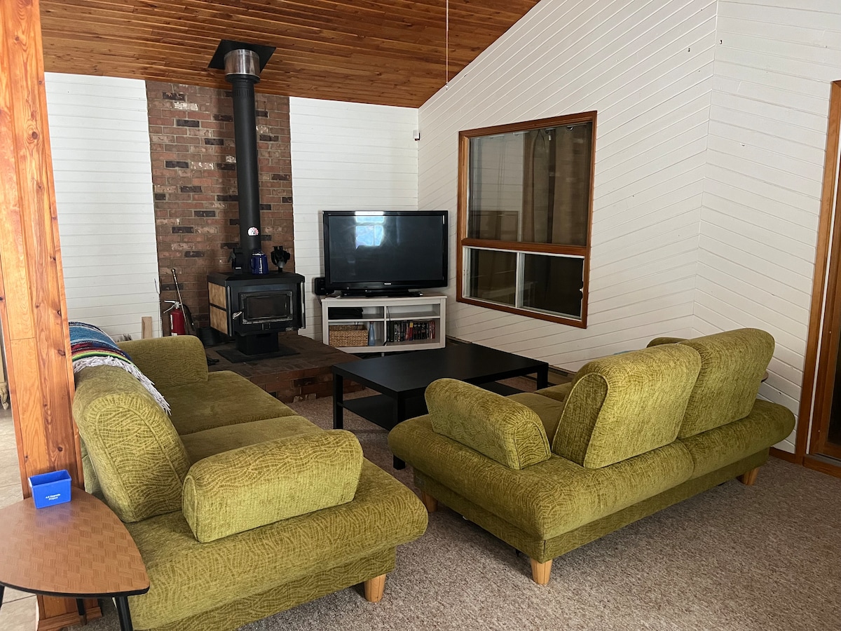 This guest suite with a private entrance, is attached to our main house, where your hosting family lives. It's located in a quiet part of town tucked into the trees with a river and walking path across the street. It would be perfect if your travelling here for work or just need a relaxing getaway. This guest suite was once a chicken coop, now turned into a modern mid-century style house that we lovingly have called the Hobbit House because of it's low ceilings.
