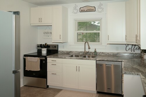 Newly remodeled! This Modern Farmhouse style home is a perfect place for a family or friends to stay. It offers 2 bedrooms, 1 bathroom with a tub/shower, a fully furnished kitchen, dining room and a large fenced in backyard. The bedrooms offer sleeping for 4 with 1 queen bed and 2 twin beds. The kitchen is fully stocked with cooking supplies and a Keurig coffee machine with several options for you to choose from. Full use of the home, fenced in back yard and a washer/dryer for your convenience.