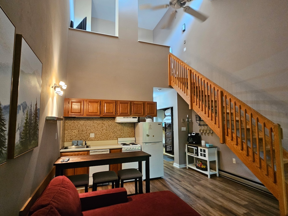 Quaint Studio Apartment, Seated at the base of Loon Mountain’s South Peak, in New Hampshire's gorgeous White Mountains. Enjoy nature, hiking and lovely mountain scenery! Skiers & snowboarders enjoy the Free Shuttle to Loon Mountain Ski Resort only minutes away. Great area dining, and outdoor activities, indoor pool, outdoor pool, Sauna, Jacuzzi and game room make this is a great vacation location for your family. Great restaurants within walking distance.