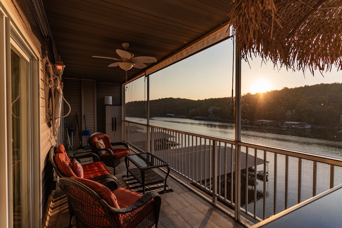 The Sunset Hideaway is here to make your lake vacation one to remember. Enjoy floating around the private dock on the lily pad or the 6 paddle floaties without the worry of boat traffic in this no-wake cove at mile marker 28. This home features 4 spacious bedrooms, a screened porch on the lower level, and a gas fire pit on the upper balcony. Plus, a hammock near the lake for some serious relaxation. The dock features a massive 15x34 slip to fit even the biggest boats and stand up paddle boards