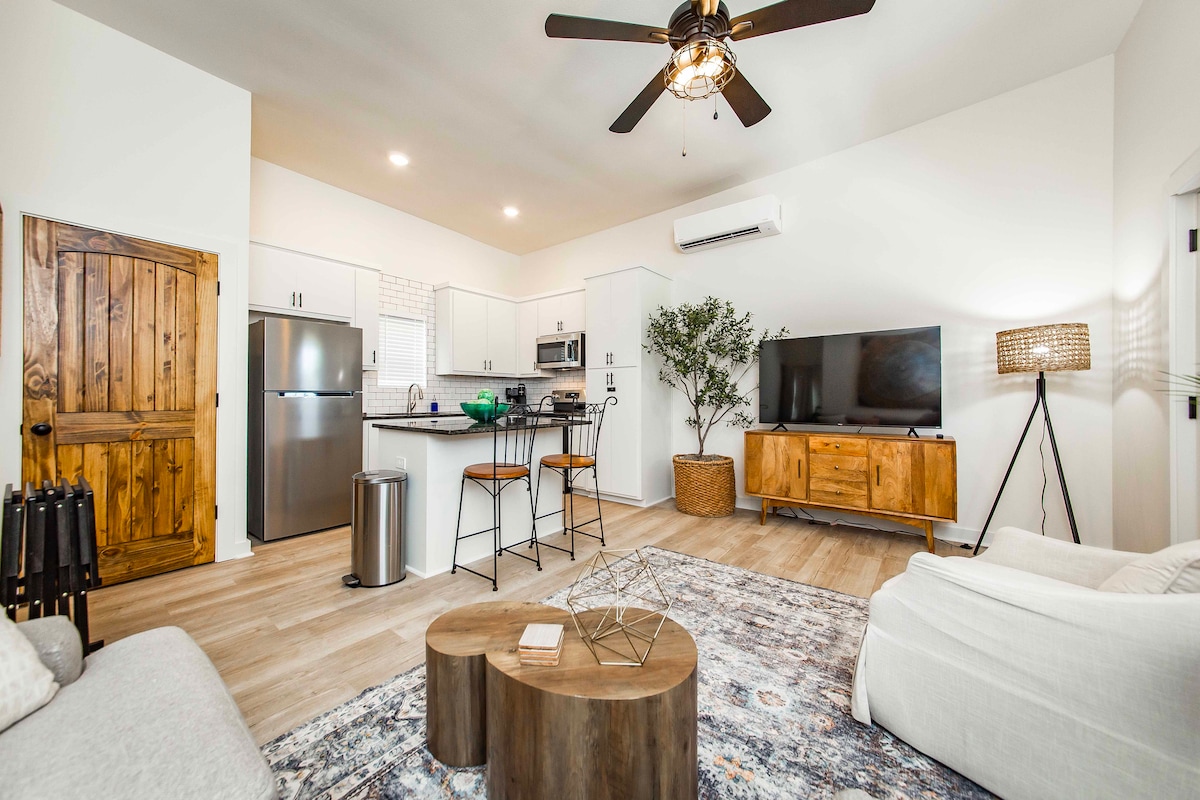 This one of a kind space is all the things you need it to be - inviting, creative, clean, comfortable, and absolutely gorgeous! We've put a ton of thought into everything from the layout to the decor to all the things that make for a great night of sleep and a splendid cup of coffee. You'll love this space! Please note the backyard and laundry room are spaces shared with other guests. Both have locking doors between them so all interior space is private.