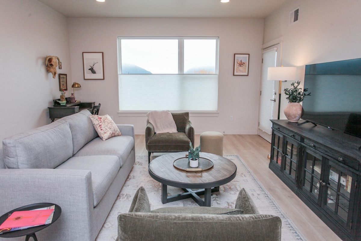 Enjoy downtown Bozeman and beyond in this beautiful and cozy Montana Mid-Century Modern condo, a conveniently located 2020 construction only one block from Main! Perfect for couples or the single traveler, you'll have a reserved parking space, a fully-equipped kitchen, high speed WiFi, smart TV with cable, a private balcony to enjoy your morning coffee, convenient 24-7 keyless access from your phone (or a code), and many more amenities as described below. We look forward to welcoming you!
