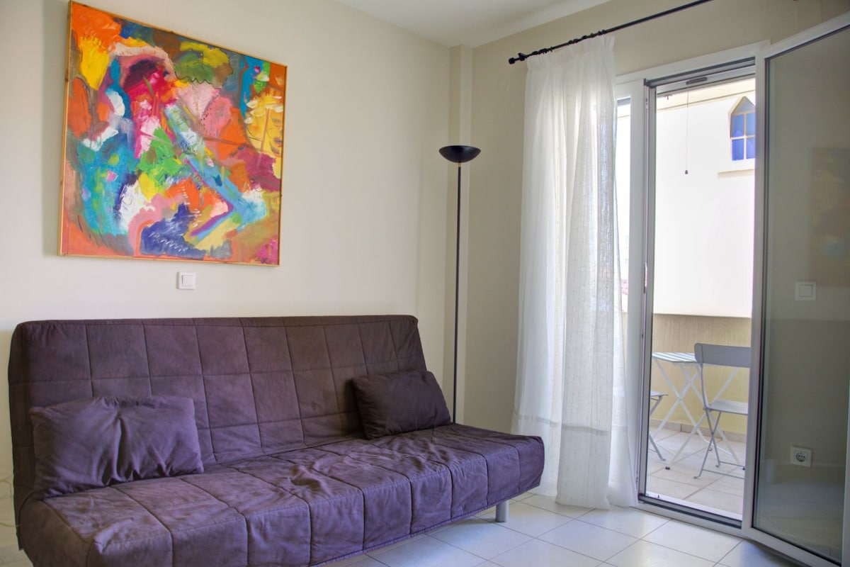 Located at a quiet street of the town, only 5 minutes walking distance from the main square (where all restaurants and coffee shops are located) and three streets away from the coast. Nicely decorated, spacious bedroom, living room and fully equipped kitchen. Ideal for couples or families with one or two children. Sofa bed in the living room, air-conditioning and wifi included.The apartments building does not have an elevator.
