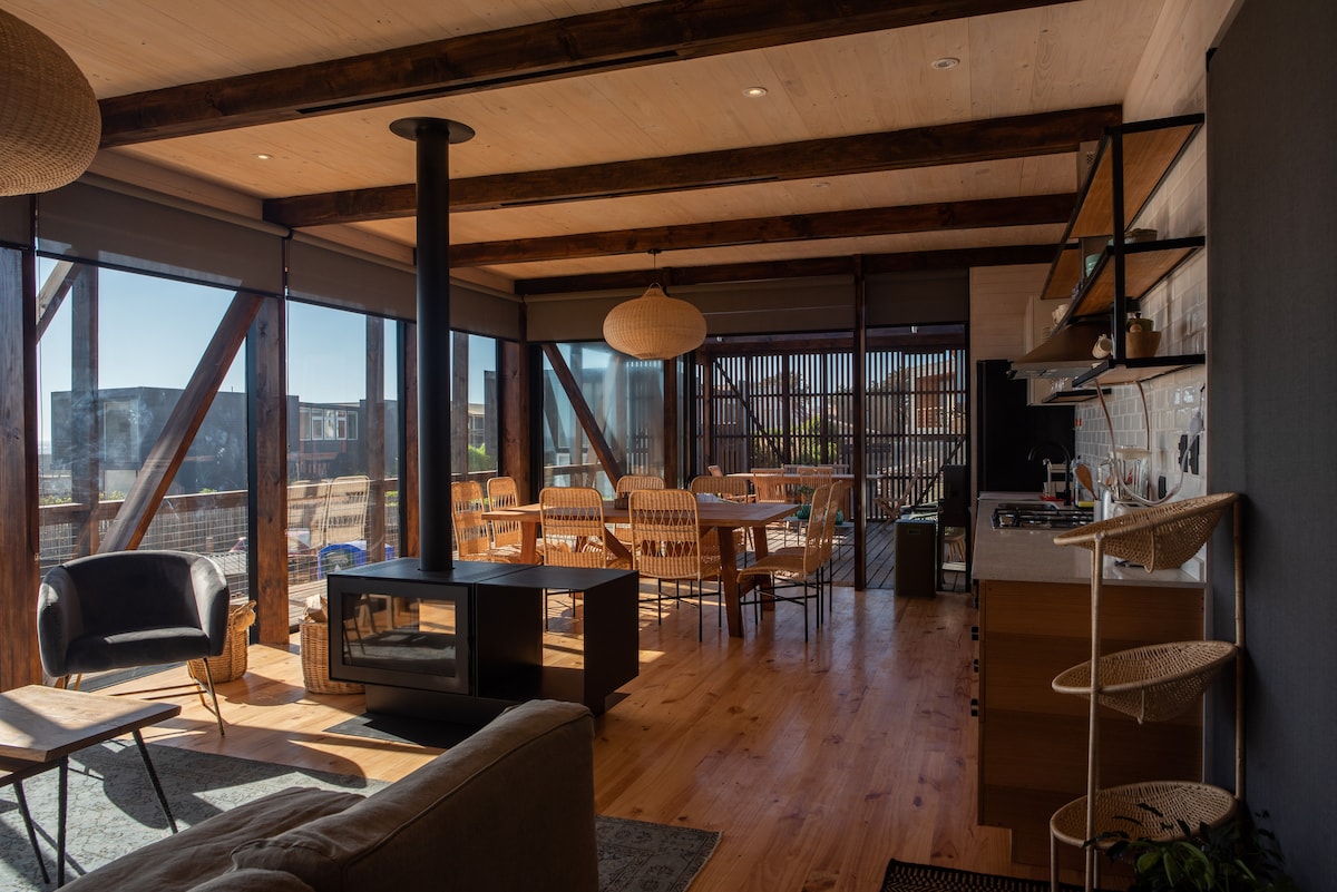 Discover Casa Balcón Design, a modern retreat in the middle of the Cáhuil forest, just minutes from Pichilemu and Punta de Lobos. It has Starlink WiFi. Designed to blend architecture, nature, and comfort, its glass and wood structure opens onto a suspended terrace with panoramic views of the natural surroundings. Located in the exclusive Balcón de Cáhuil sector, the house combines contemporary design and absolute tranquility, with quick access to beaches, salt flats, and local cuisine.