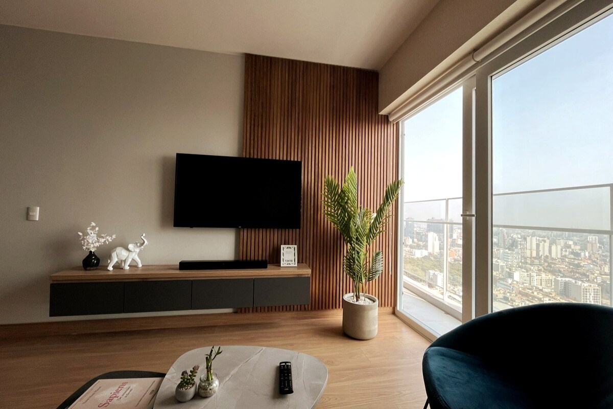 Wake up to open skyline views just half a block from Kennedy Park, in the heart of Miraflores. This luminous boutique loft is ideal for longer stays and remote work. Floor-to-ceiling windows throughout the apartment offer views over Av. Diagonal, the building’s garden courtyard, and the Miraflores skyline. Enjoy rooftop pool, gym, coworking, private parking, ultra-fast Wi-Fi, self check-in, and 24/7 reception—steps from cafés and Lima’s best dining.