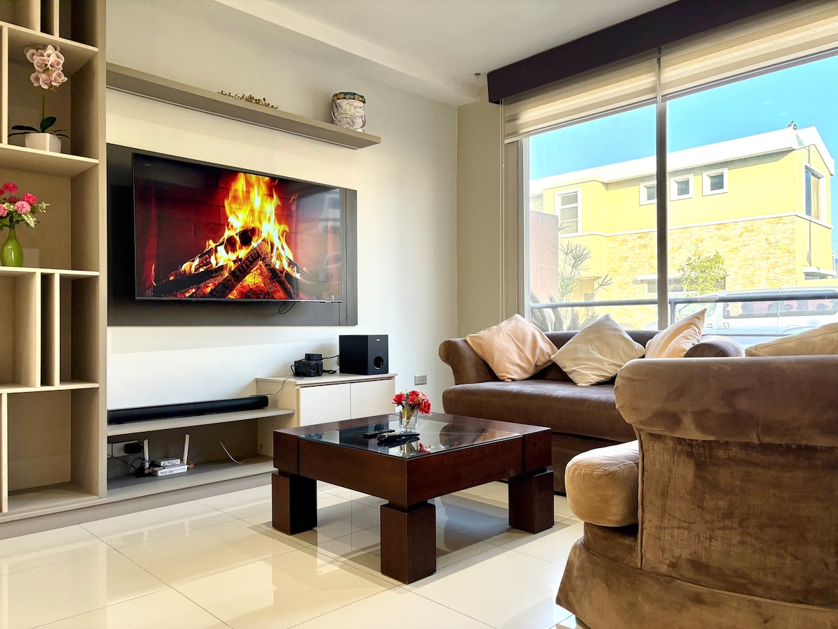 Modern luxury apartment in a minimalist style, in a privileged area, 24/7 private security and all the amenities for families or executives looking for a space of convenience, tranquility and comfort, located in front of the El Dorado shopping center, 3 bedrooms each with its tv netflix, amazon prime and its air, the room has a 65-inch tv, we have ultra-fast 100 mbps internet