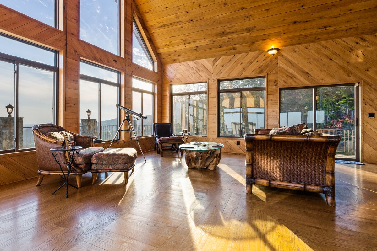 Escape to our serene cabin at the edge of the world with breathtaking views all around. Just 15 minutes from Hanging Rock and Pilot Mountain State Parks, and 30 minutes from Winston-Salem, enjoy sunrise and sunset from our wrap-around porch, hot tub, or indoors. The open living space features floor-to-vaulted ceiling windows and wood-burning fireplaces. Accommodates 8-10 guests with 3 bedrooms and 3 full bathrooms. New cleaning team. Please note: No pets, no smoking, and no events allowed.