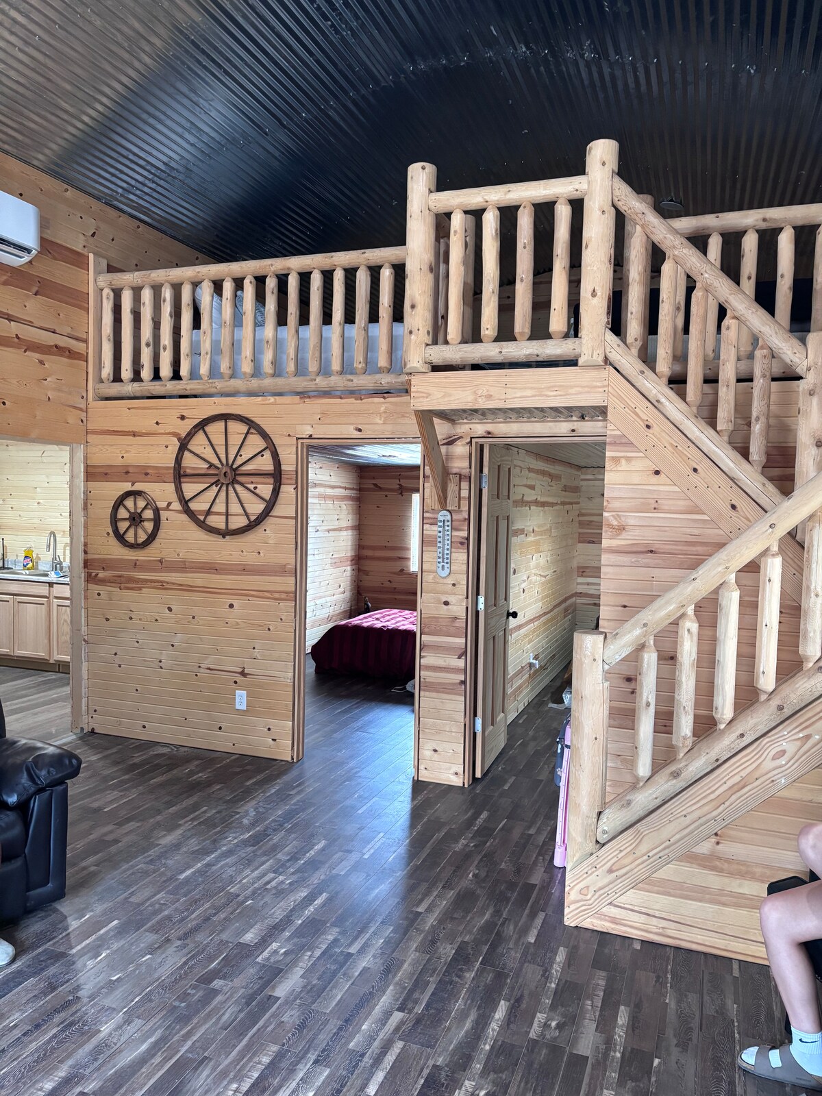 Come and relax in our hunting themed, rustic shouse, with a great view! We have a 9 acre lake that you can take a swim, relax by the water or do some kayaking! King size bed downstairs with a full bath, and two full size beds upstairs with a 1/2 bath. Full kitchen! Pet friendly! This place was built in 2021 and we lived in it until 2023 while our home was being built on the same property. We share the same yard and lake. We do our best to make it private as possible.