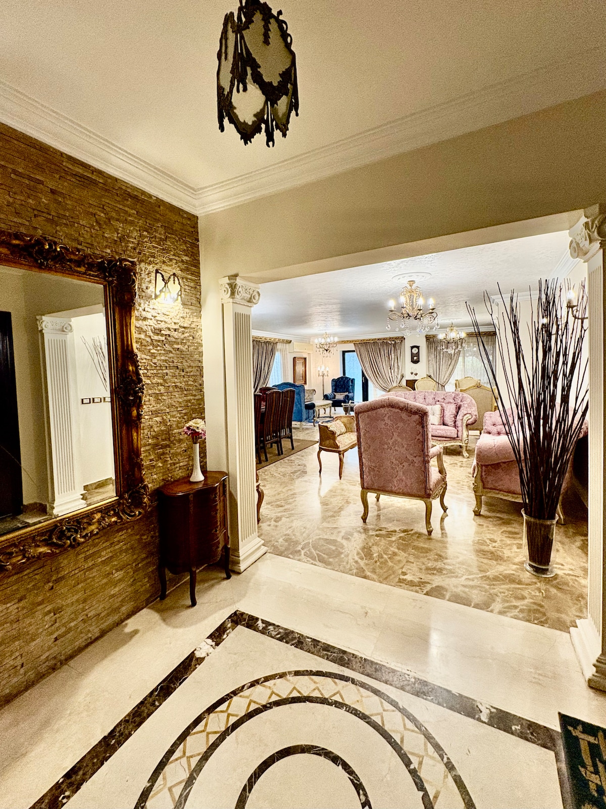 Fantastic fully furniture 3 double large bed rooms apartment, Located in New Cairo, 25m from Cairo Int. Airport in a beautiful villa with private entrance in a very prestigious quite area where guests can relax and enjoy the Egyptian atmosphere. It has spacious beautiful living area, fully equipped kitchen, large balcony with landscape view, a master room with queen size bed with private bathroom and shower. The other 2 BR has 4 single beds served with large bathroom and bath tube.