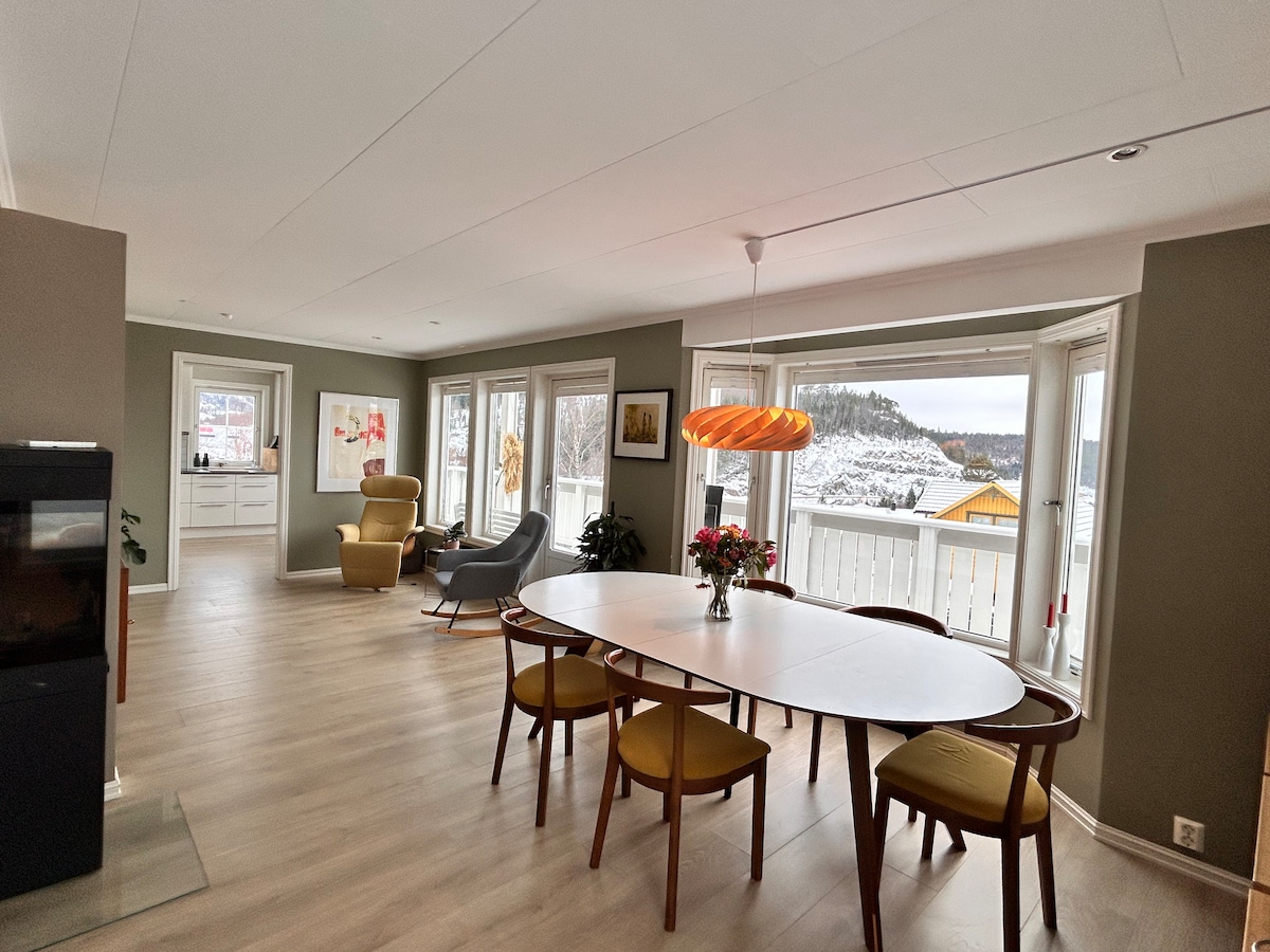 Oppusset og innholdsrikt hus med god plass, stort uteområde, fantastisk sjøutsikt og gode solforhold. Huset tilbyr blant annet 2 bad, 4 soverom, 3 dobbeltsenger, en barneseng (enkeltseng) og mulighet for en ekstra enkeltmadrass tilknyttet en av soverommene. I kjeller kan også treningsrom på 24kvm benyttes dersom det er ønskelig. Huset ligger 20 min unna Værnes flyplass, 20 min unna Trondheim og 7 min gange til nærmeste busstopp.