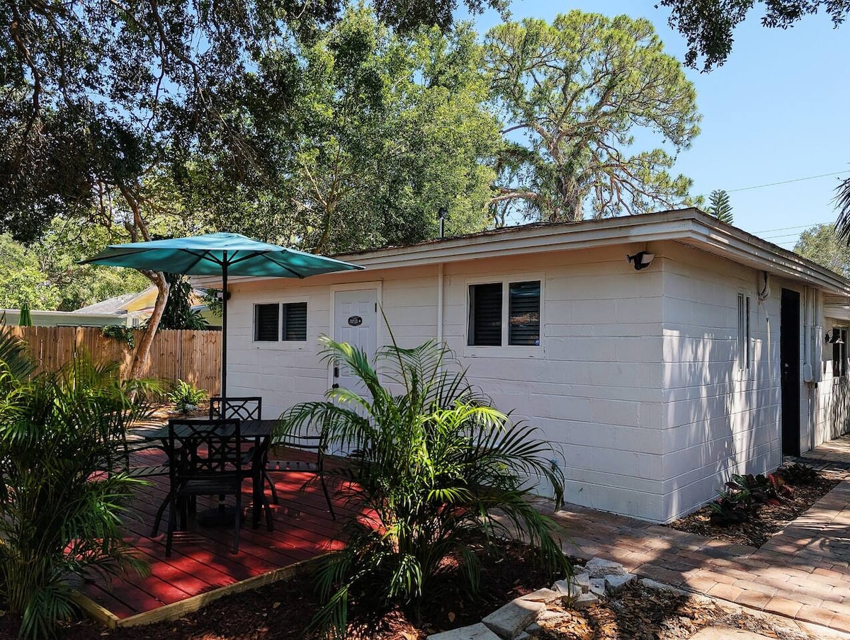 One block from Sarasota Bay - completely remodeled and fully furnished guest apartment with a Miami deco feel. The unit is a little over 300 sf with full kitchen, one bathroom w/ shower, comfy queen bed, several stools/ chairs, flat screen tv, wifi, off-street parking, six USB ports for easy charging and sitting area outdoors on front porch. Five minutes to downtown or SRQ airport, 15 minutes to Lido Beach, and 25 minutes to Siesta Beach with easy access to University Parkway or Fruitville Rd.