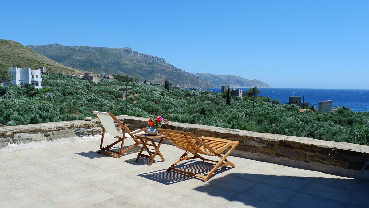 Traditional tower of Mani located by the historical beach of Kyparissos. A stone-built house including an attic, a main floor with fireplace and a veranda with amazing view to south Aegean. Down to the garden, you may enjoy a walk among olive and pine trees. 400 metres away, you may swim in Kyparissos beach or walk through a path of ancient monuments till the famous beach of Almyros. The location is quiet, near Gerolimenas port, Vathia village, UNESCO world heritage, and Cape Tenaro.