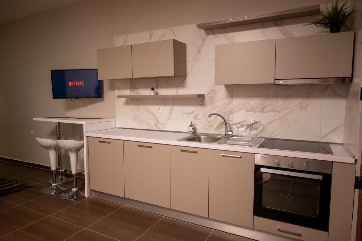 Ολοκαίνουργιο, ζεστό,πανέμορφα διακοσμημένο στούντιο, ιδανικό για ζευγάρια με πανοραμική θέα στη λίμνη της Καστοριάς που κόβει την ανάσα!!! Χαλαρώστε στο king size κρεβάτι και απολαύστε την μαγευτική θέα! Υπάρχει δυνατότητα τοποθέτησης extra πτυσσόμενου κρεβατιού για φιλοξενία ενός ακόμα ατόμου. Διαθέτει ένα μικρό καθιστικό και πλήρως εξοπλισμένη κουζίνα με φούρνο, εστίες αφής, ψυγείο, τοστιέρα, βραστήρα κ.α. Απέχει μόλις 150μ από το κέντρο της πόλης. Διατίθεται ελεύθερος χώρος parking.