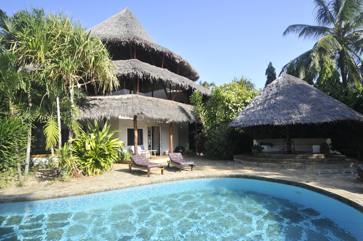 Traditional Swahili style house, stands on coral headland overlooking sea, beach, beautiful flowering gardens, private access to beach. Swimming pool recently installed, SEE HOUSE RULES Villa has 2 levels & views of Indian Ocean, private direct access to the beach, which stretches out either side, within the Marine Park. Includes 3 staff, cook, and daily room service, and gardener. Sleeps up to 10. Easily adapted and made comfortable to host smaller groups, by using just the upstairs bedrooms.