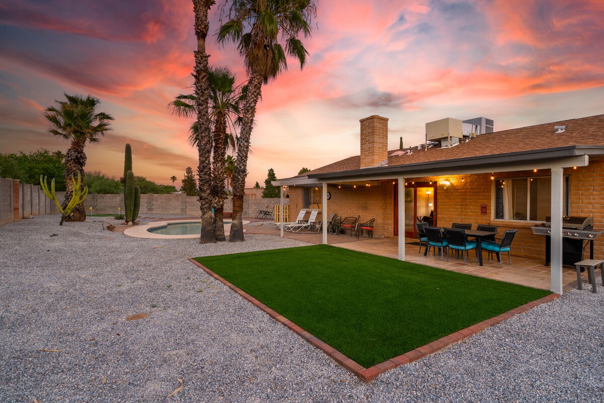 Escape to peace and tranquility in your private, just remodeled, 4-bedroom, 1850 sq. ft desert oasis. You will be in peace surrounded by desert views in your own large private backyard with grass, putting green, pool, and fireplace. You will be surrounded by the stunning views of the Catalina Mountains and an amazing view of downtown. Located close to shopping, restaurants, golf courses and hiking. Downtown is only 15 minutes away! Saguaro National Park is 11 minutes away! Golf is 5 min. away!