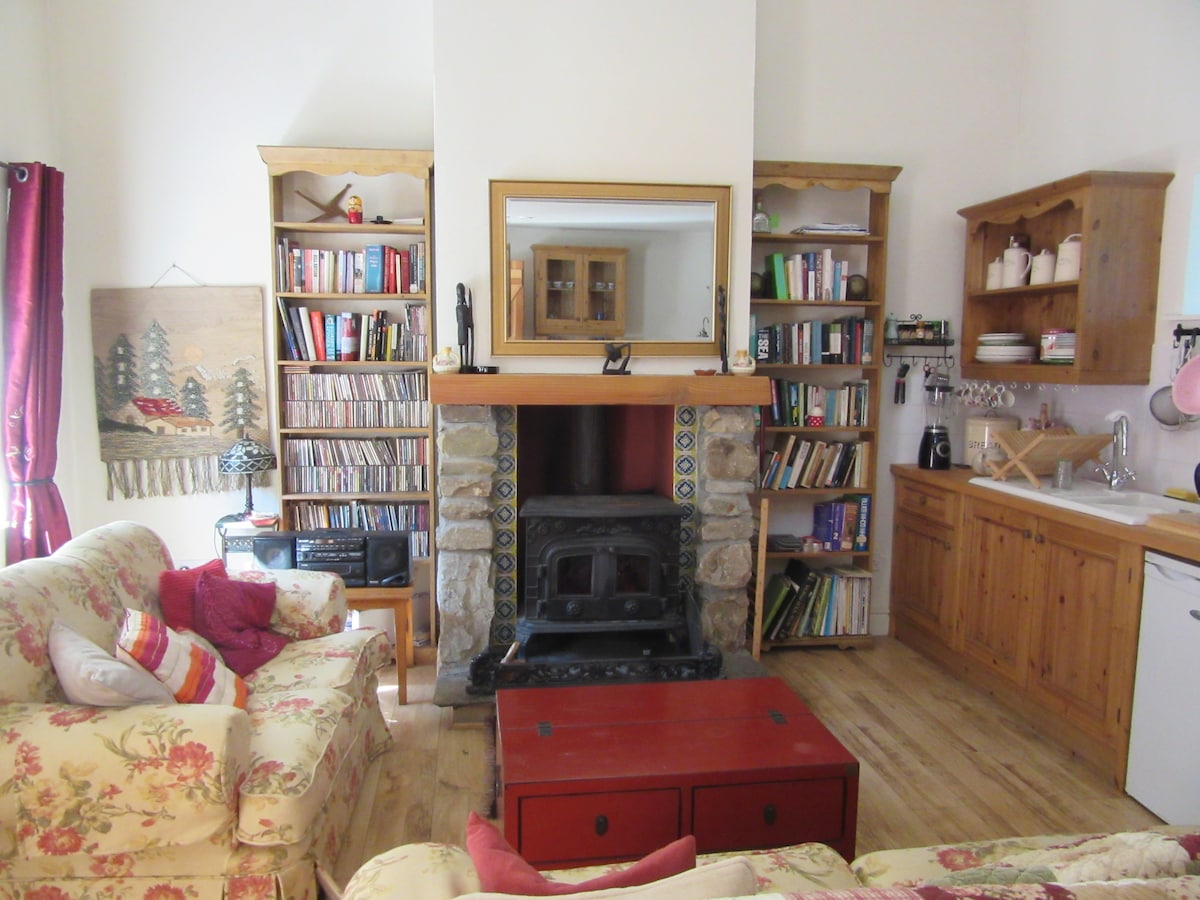 Entire place . Lovely light airy place with sea views, open fire , sleeps 2. Own entrance to entire place panoramic sea views with access to beach from property . Fully equipped kitchen, complimentary tea & coffee and some kitchen basics oil, flour salt pepper. Dining area, sitting room and ensuite double bedroom. Shower room downstairs in our antique shop which is opened 1-5 during the summer months.