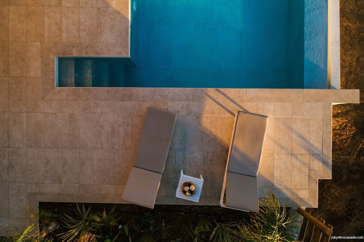 CasAelia will provide you a unique experience in Zakynthos. The house is located next to a Mediterranean olive grove. You’ll be charmed from the sea-view that this house (Casa). From the front terrace, you will enjoy both the sunrise and sunset. Also, one can see a big part of the island, Cephalonia island and to the right the Peloponnese. This property provides 2 modern bedrooms, 2 shower rooms, a large living area, a kitchen and a garden with a private heated pool (extra cost).Depth 1.40 m.