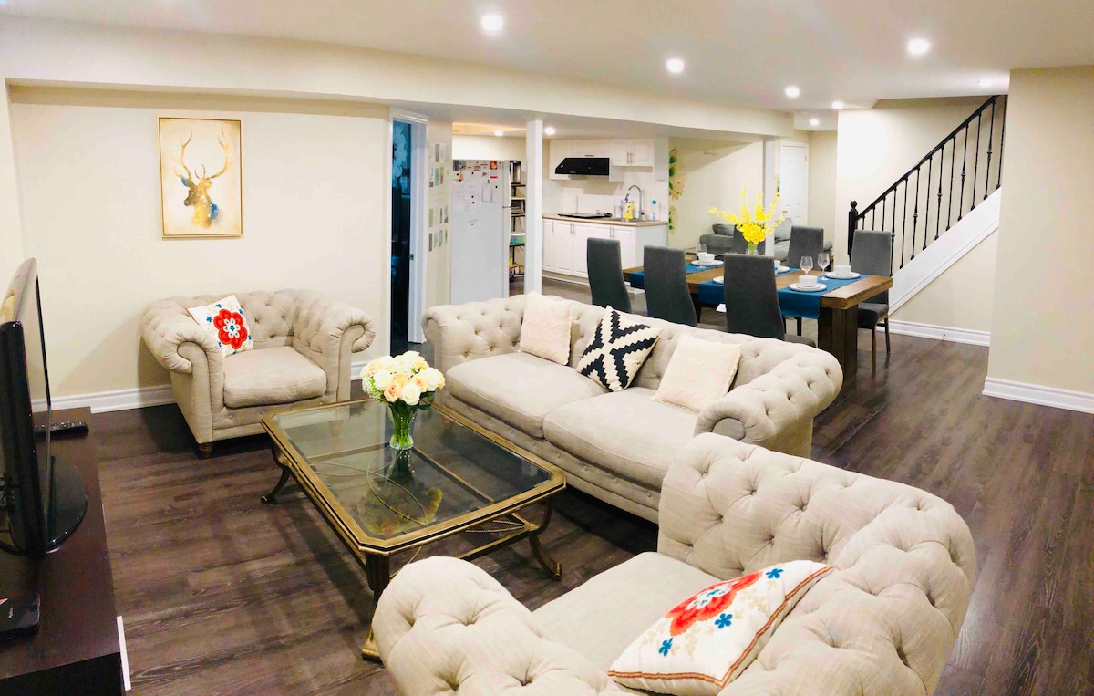 Downtown Markham. Near grocery stores, Malls, Pan Am Centre, Markham's York University, Main St. Unionville, and restaurants. Transit access to Toronto via the GO train station or by car via the DVP. This modern sub basement has a big window, private full kitchen and bathroom, W/D, A/C, heating, one car parking, comfortable Queen size bed, sofa bed, and a 55" TV. We're very proud to be listed as a "Super Host", "Guest Favourite" & ranked in the top 1% of house listings based on reviews.