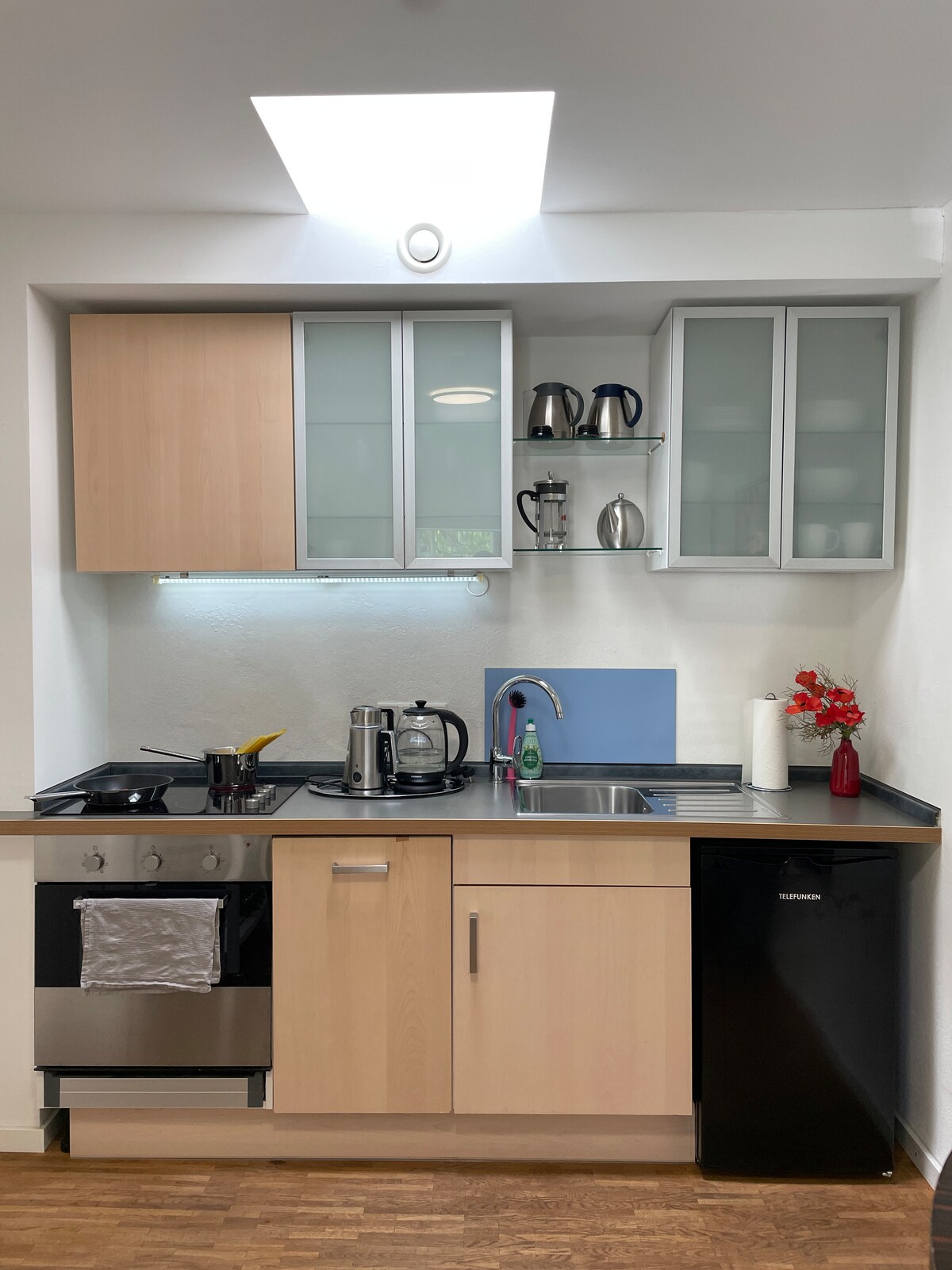 We rent our centrally located newly furnished small apartment with a living room and bedroom, separate small kitchen, bathroom, small hallway and a cozy conservatory, which is furnished as a dining room. The kitchen has the most important utensils and appliances for self-catering. The large built-in wardrobe in the hallway offers enough space for your wardrobe. We look forward to seeing you soon and will be at your service for any questions you might have!