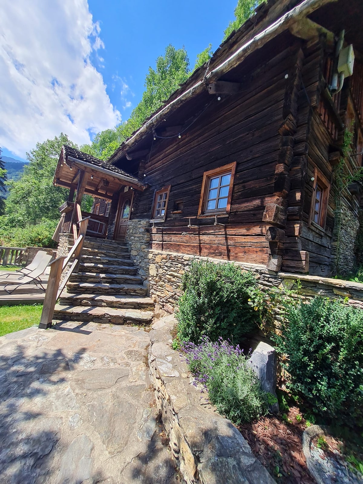 100-year-old log cabin, which was demolished in the neighboring village in 2008 and rebuilt at our organic mountain farm. Particular care was taken in the use of natural building materials (reed, clay plaster, old wood). Traditional larch shingles serve as roofing. The house is heated by a large kitchen stove and a solar thermal system. The bathroom has underfloor heating. The cozy little house (75 m²) served as our residence for 10 years.