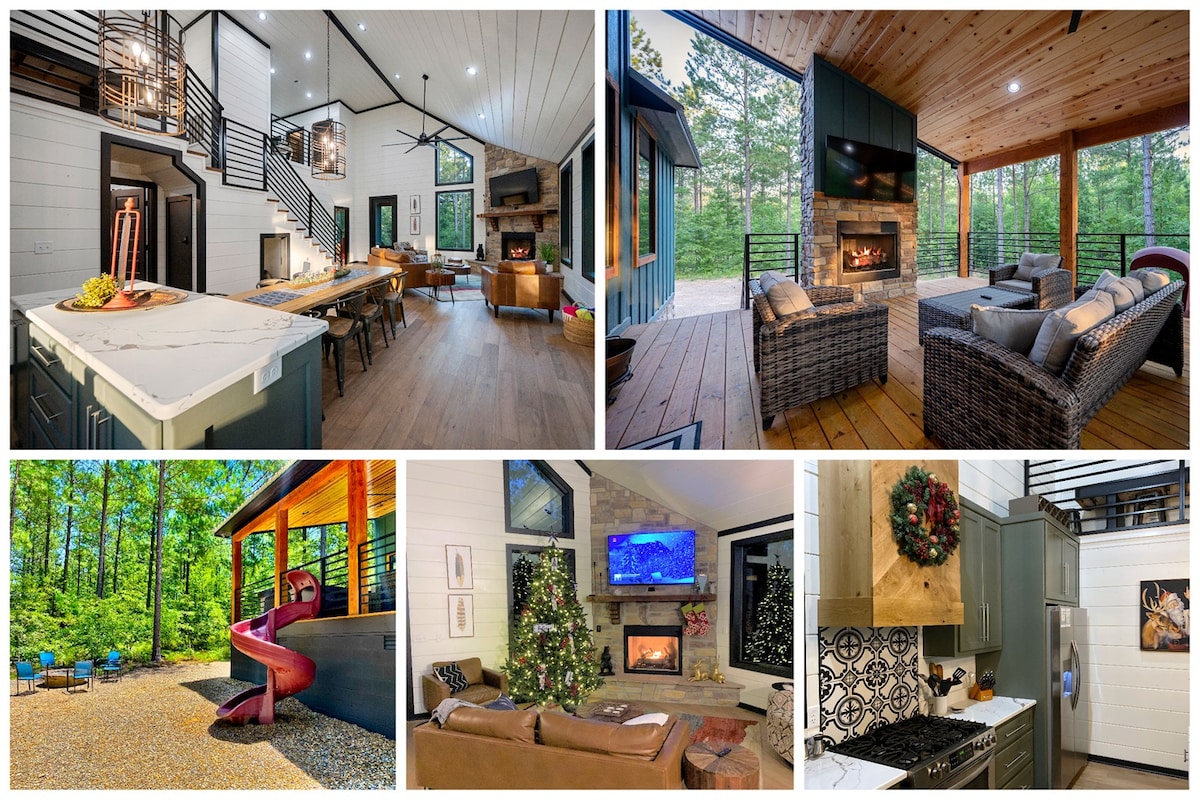 -New Modern Construction Cabin - Kids will have a blast sliding off the deck playing games outside and roasting smores in the firepit -Firepit, Hot tub, seasonal plunge pool, gas fireplace and patio seating outside with 65" TV. -Geodome climber, Tetherball Horseshoes and Cornhole -Dual king Suites with ensuite bathroom and dual showers. -Separate Upstairs Bunkroom -Casino, Grocery Stores, Beavers Bend State Park all about 10 minutes away, located away from the major traffic in Hochatown