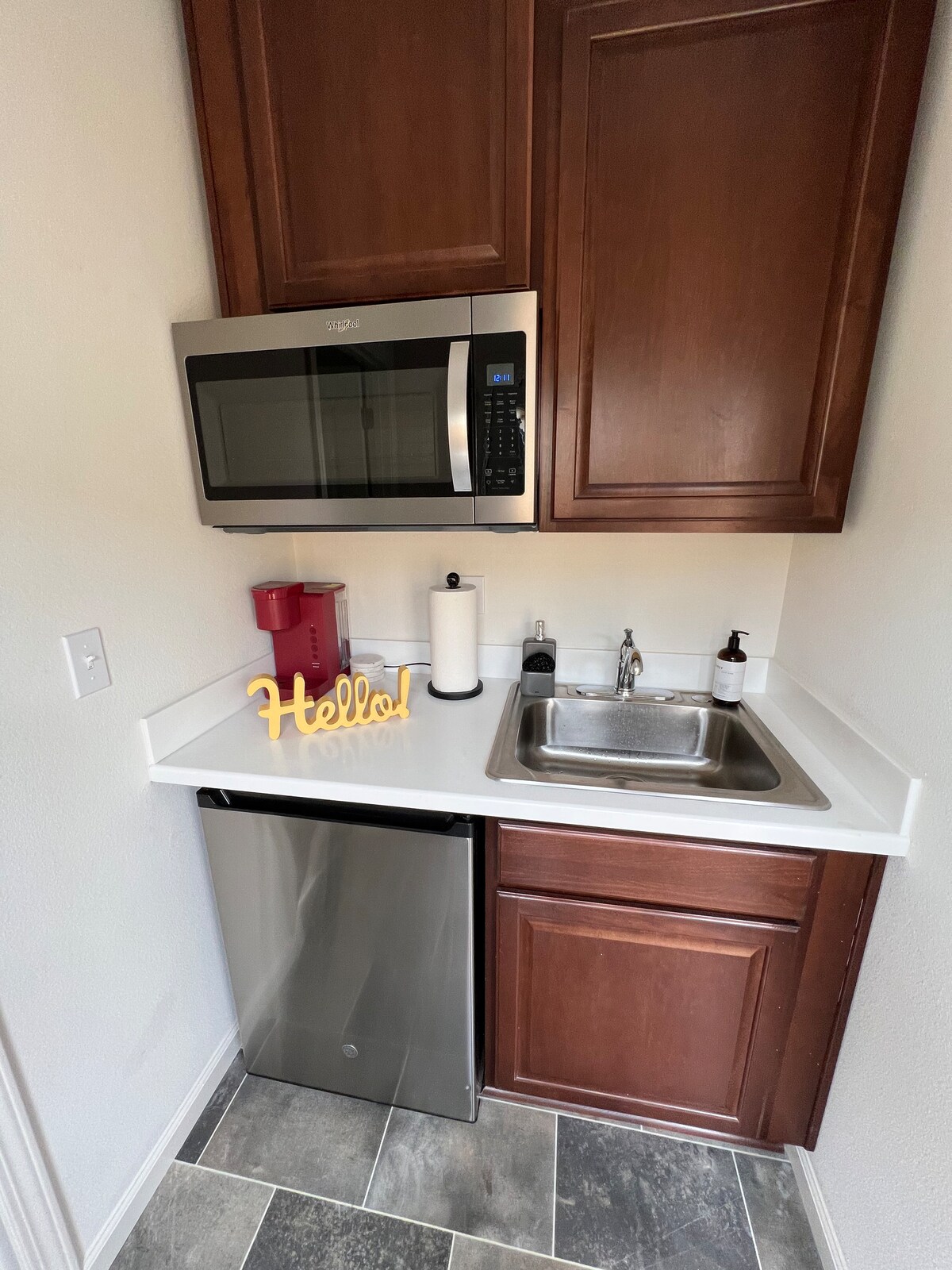 Enjoy this private guest suite with a dedicated entrance to yourself. Kitchenette is equipped with basics, including a microwave+, a one burner convection stove top, a full size refrigerator with ice maker, and a portable kitchen island on wheels with a butcher block. This mini-like apartment is located within a newly constructed neighborhood and is in close proximity to a private park/sports complex.