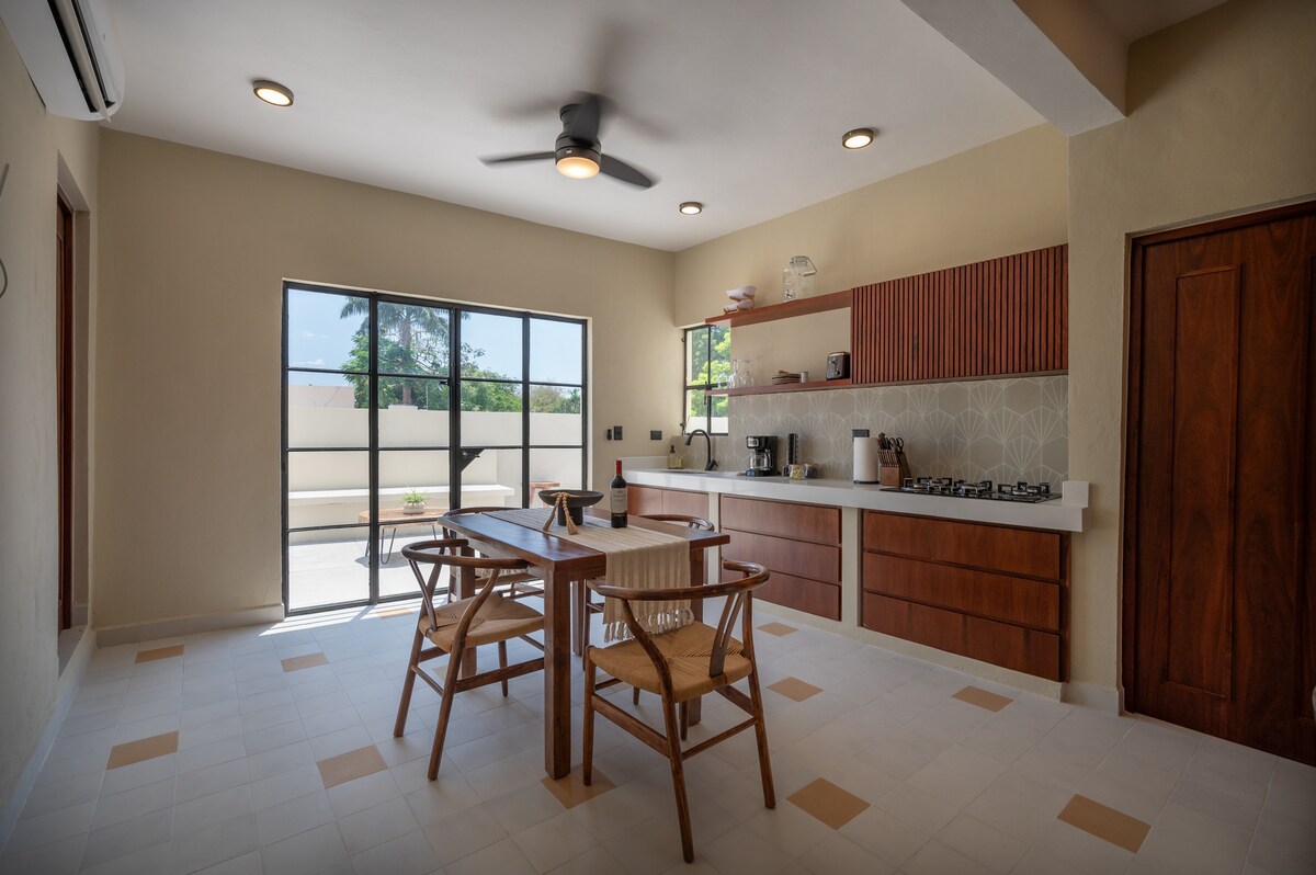 Small and cozy villa with contemporary Mexican design, with everything you need for long and short stays, ideal for resting or home office. Equipped with a full kitchen, living room, bathroom with hot water, air conditioning, fans, high-speed Wi-Fi, private patio with trees, swimming pool and shared laundry within the facilities. Excellent location, a few steps from Paseo Montejo near Walmart, banks, bars and restaurants.
