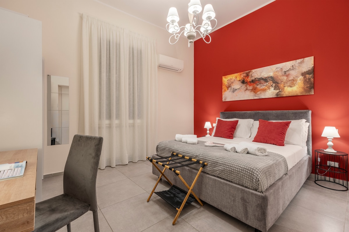 king deluxe room with balcony, private bathroom. Free parking on the street or private paid parking. The room is equipped with a LED TV, desk with chair, clothes hangers, minimal backlit recessed bedside tables, a USB socket, a personal HOTSPOT WI-FI in the room, air conditioning, radiator heating, wooden thermal break windows, bed with orthopedic base and Memory Foam mattress with Memory pillow.