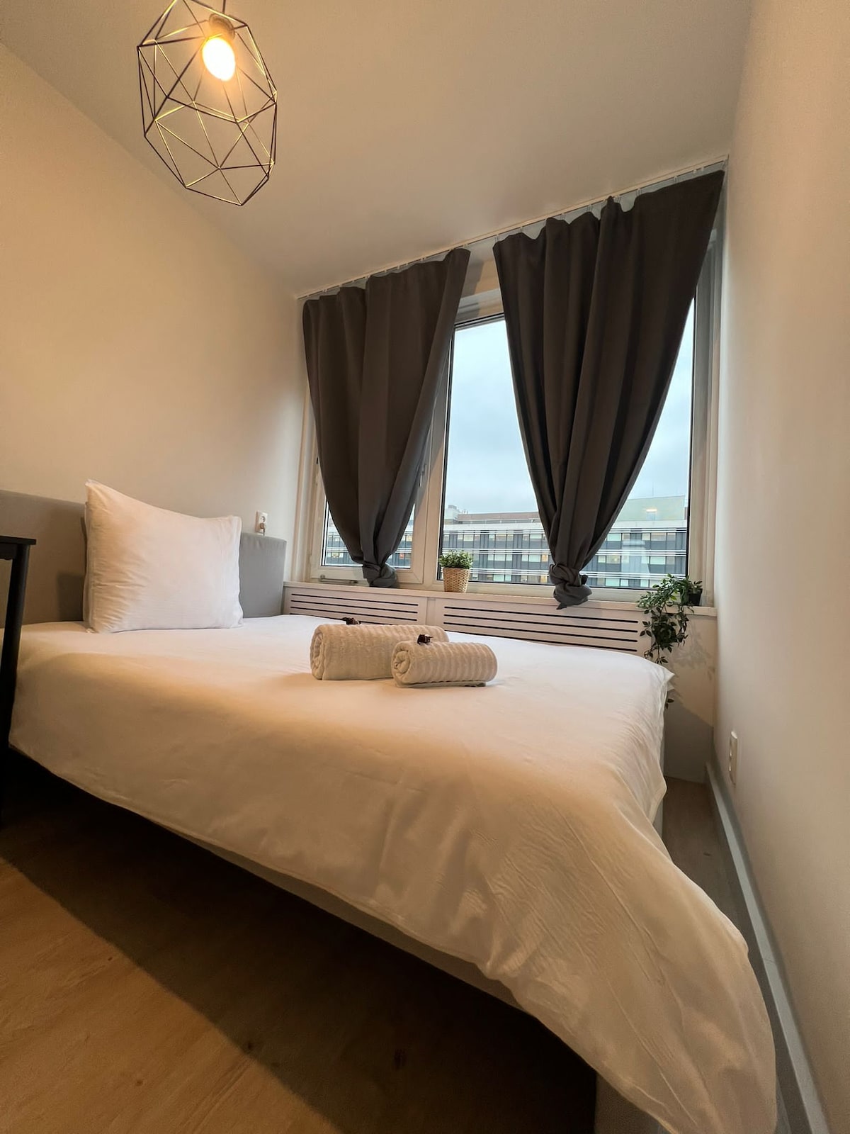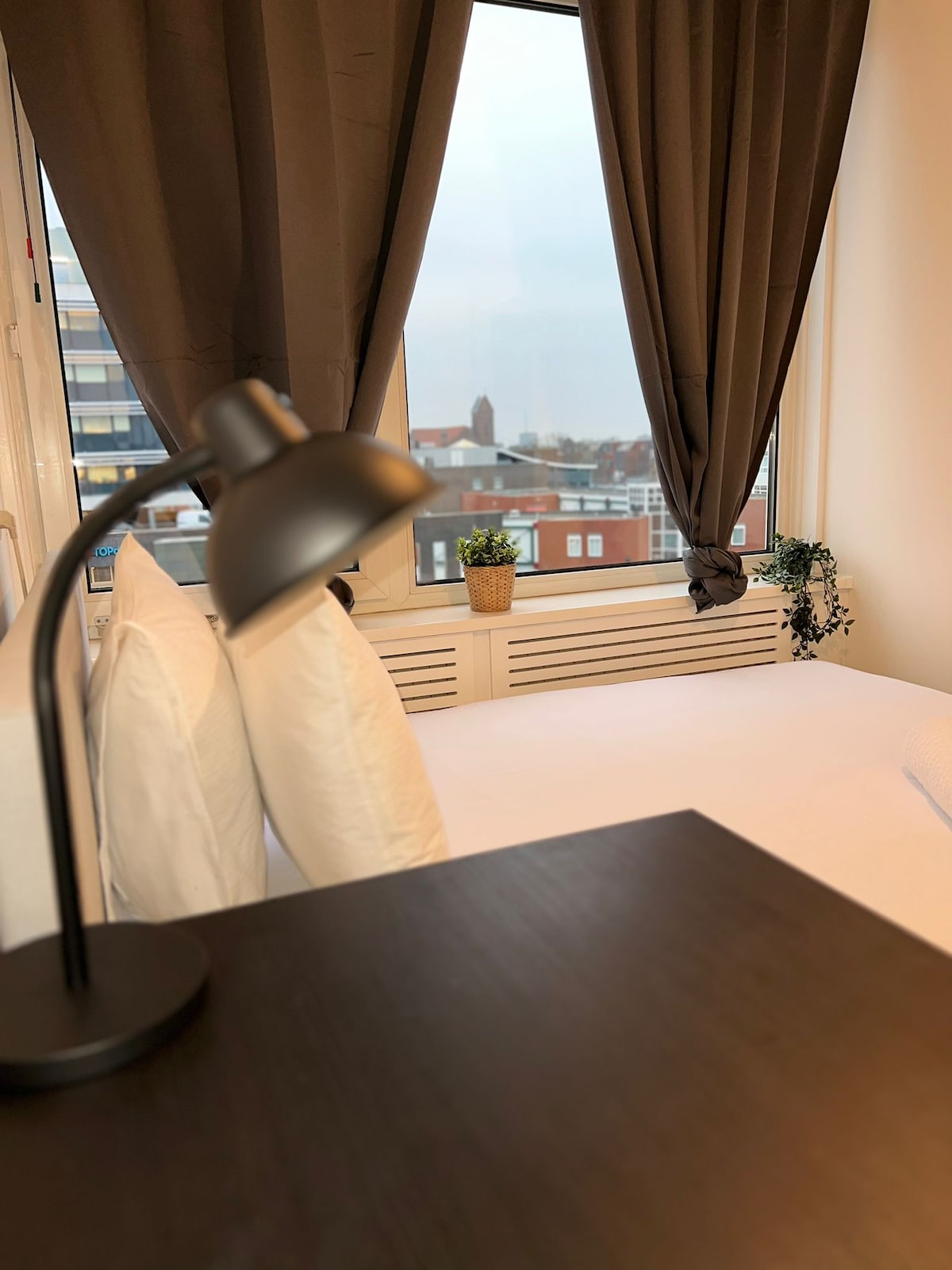 A neat furnished bedroom for one neat lady in a clean apartment. Room has a beautiful view of the center of Schiedam. 10 min walk to Schiedam central station. 1 min walk to the tram directly to Rotterdam Central station and centrum. 10 min walk to the Schiedam shopping mall. Room now has thick curtains to darken the room in sleep time! You’ve access to a neat furnished bathroom, toilet and kitchen.