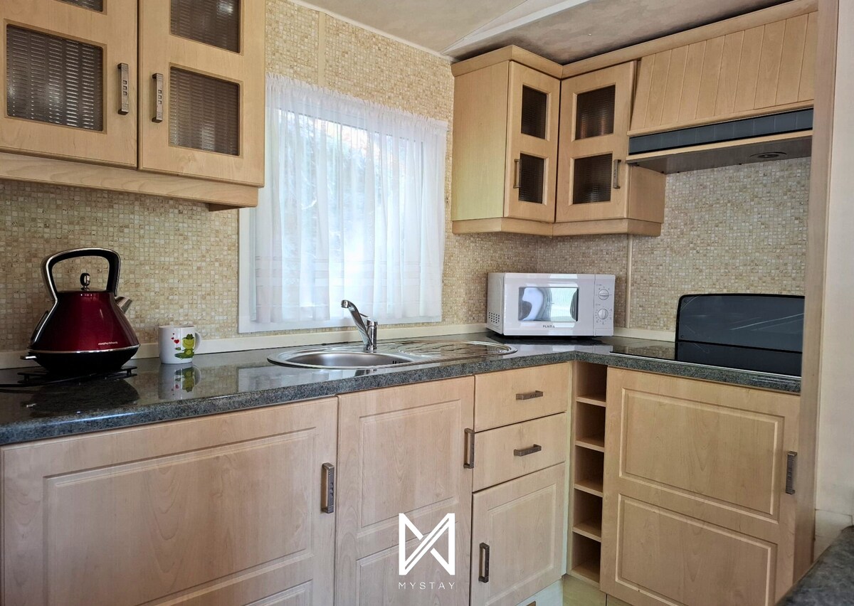 Bungalow in Quinta do Castro, surrounded by nature and with great privacy, having been renovated and expanded. It has a large living room, two bedrooms, a fully equipped kitchen (2-burner gas stove, microwave, wood-burning stove/salamander with oven, kitchen furniture, etc., bathroom and porch). Outside, there is a granite table and grill. Free access to all the Quinta's facilities: 2 swimming pools (one of them covered), soccer field, tennis, slide, playground and lounge.