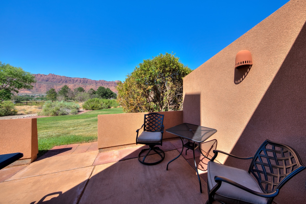 Relax and recharge in this updated Moab condo overlooking the 11th and 12th greens of the Moab Golf Course. Enjoy private parking, a full kitchen, modern furnishings, new flooring, and thoughtful finishes throughout. Step onto your private patio with BBQ, cool off in the seasonal, pool (now open) and rest easy knowing this pet-friendly space comfortably sleeps five. A calm, reliable home base close to Moab’s best adventures—book with confidence and unwind the moment you arrive.