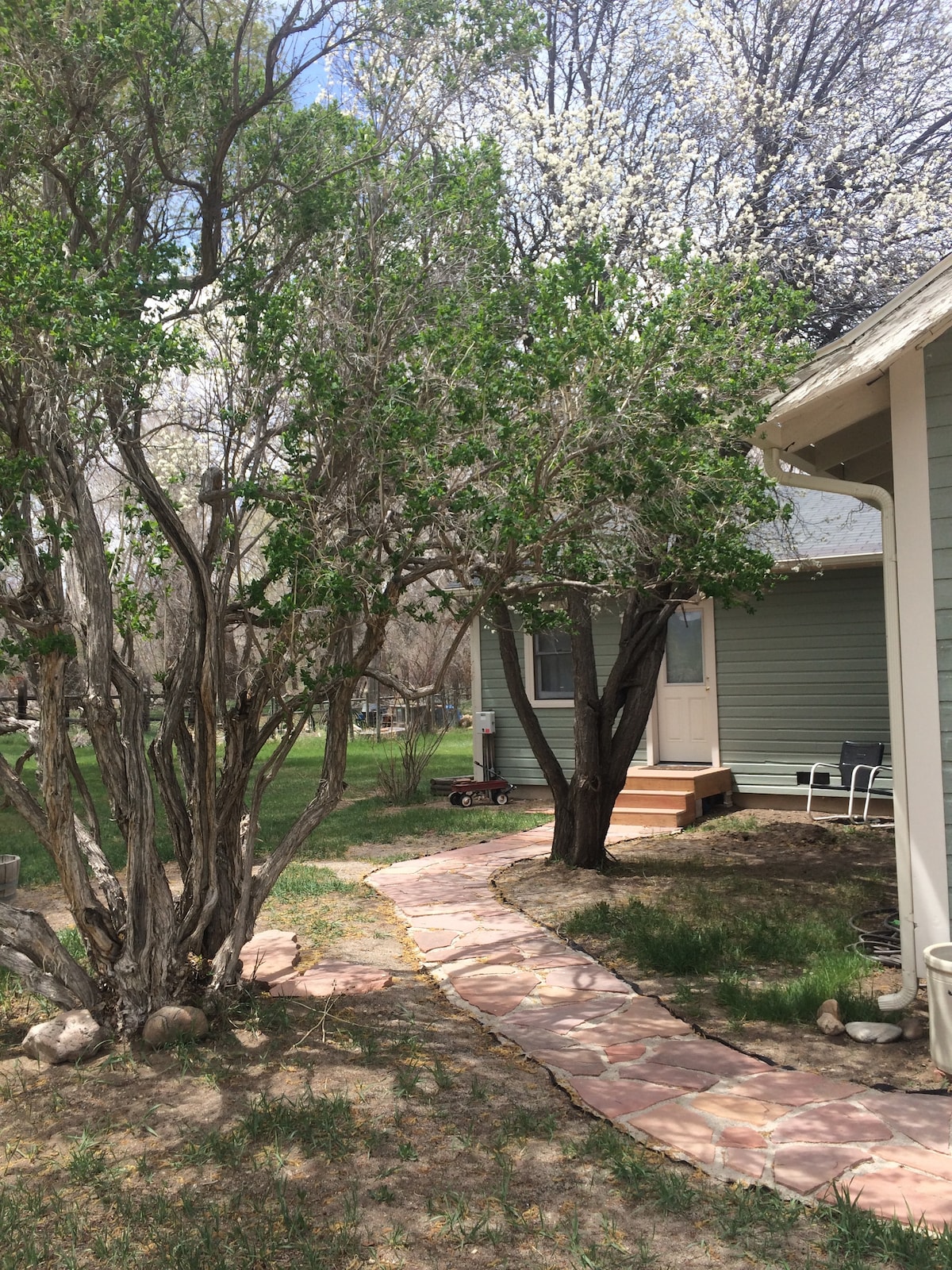 Come enjoy our private 5 acres of Pinon trees with the convenience of being 5 minutes from town. Enjoy the joys of children on property and views of incredible mountains with the wildlife that frequents our "back yard". Relax in our private guest area locked off from the rest of our home including a kitchenette and laundry area, all separated from the rest of the house by a custom built and locking doorway. We accept dogs but cannot accept cats due to other guests’ allergies. There is a pet fee.