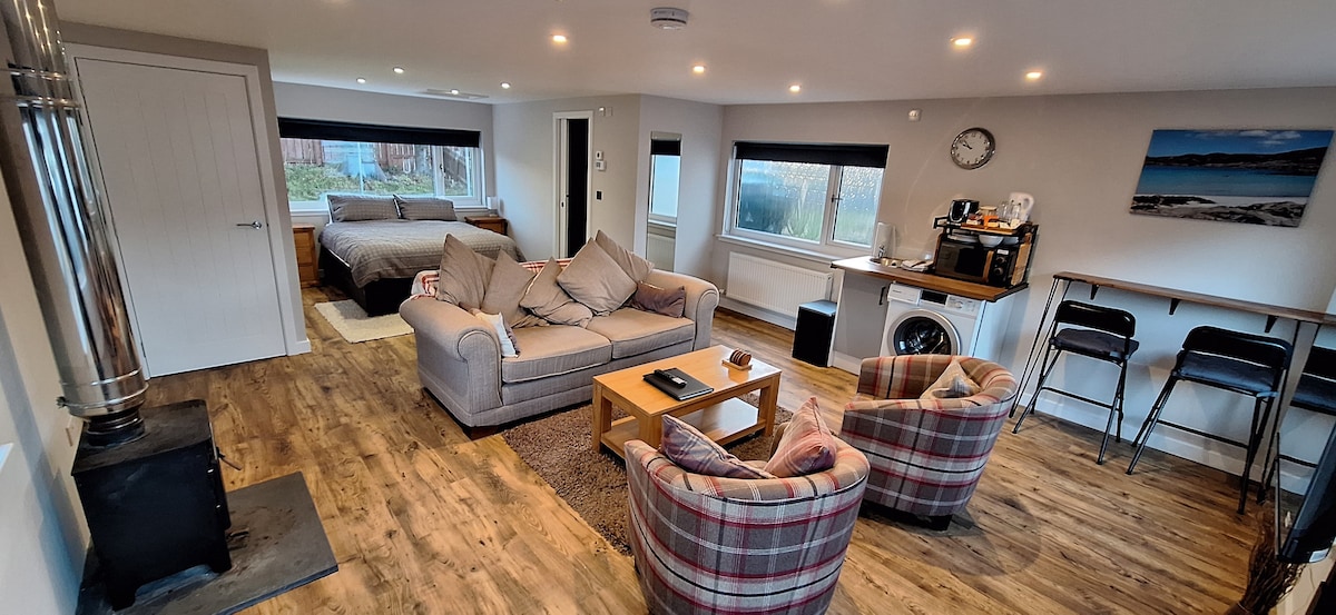 The Snug is a modern self contained compact studio,recently renovated ,situated in a good location in the village of Ullapool,close to all local amenities. One of a few ,local guest accommodations that accepts one night stays. The Snug has a double bed (Simba ) ,shower, toilet, TV, ( free view) free WiFi, tea & Nespresso coffee machine, also towels/linen supplied.A small fridge on site. Best suited for couples or singles. Free on street parking & not in Cul de Sac or right outside my neighbours!