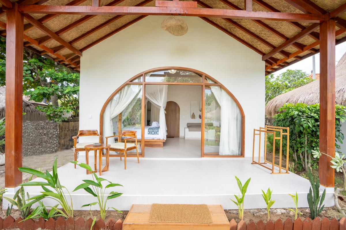 Experience quiet luxury in nature – with sweeping ocean views from the hills. where you can watch the sea from above and breathe in the cool hilltop breeze. This is a place to recharge, and simply be. you’ll find an intimate, minimalist space made with natural materials — bamboo, wood, linen — blending rustic charm with comfort. and a private terrace invite you to linger with a book, a coffee, or simply the view. Perfect for anyone looking for a serene escape surrounded by nature.
